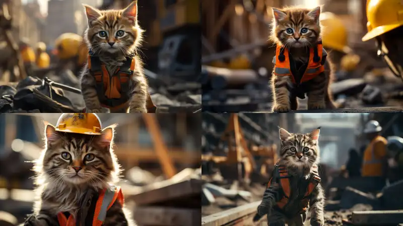 Midjourney Bot 更新时间:2024-08-06 00:07A cat dressed in construction worker's clothing, wearing a safety helmet, carrying steel bars on its back, walking on a construction site in the background --v 5.2 --ar 16:9 --s 265
