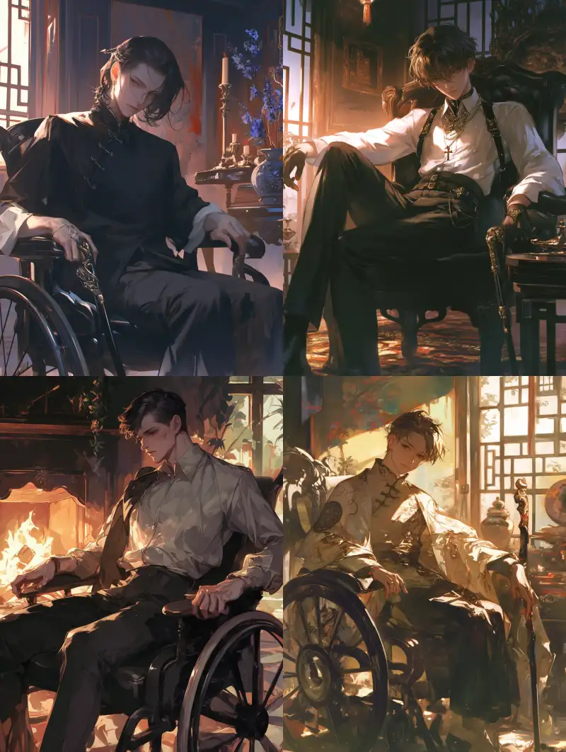 Midjourney Bot 更新时间:2024-08-06 00:05A 27 year old young man with an expressionless face, a melancholic temperament, short black hair, wearing an expensive shirt and suit pants, sitting in a wheelchair in the study with disabled legs. Fireplace. There is a noble style black wooden cane beside me. Exquisite, complex lines. --niji 6 --ar 3:4