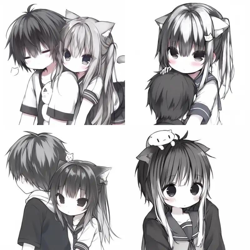 Midjourney Bot 更新时间:2024-08-06 00:10The girl has long hair and bangs, wears JK, holds a cat for the little boy, and the boy wears school uniform with a shy expression --sref