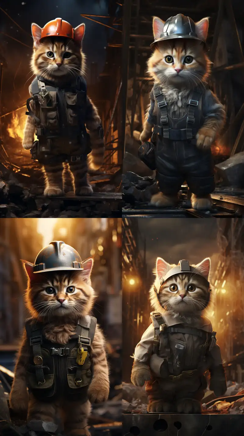 Midjourney Bot 更新时间:2024-08-06 00:11Realistic personification, a cat wearing construction worker's clothing, wearing a safety helmet, carrying steel bars, walking on a construction site with the background of the construction site --v 5.2 --ar 9:16 --s 265