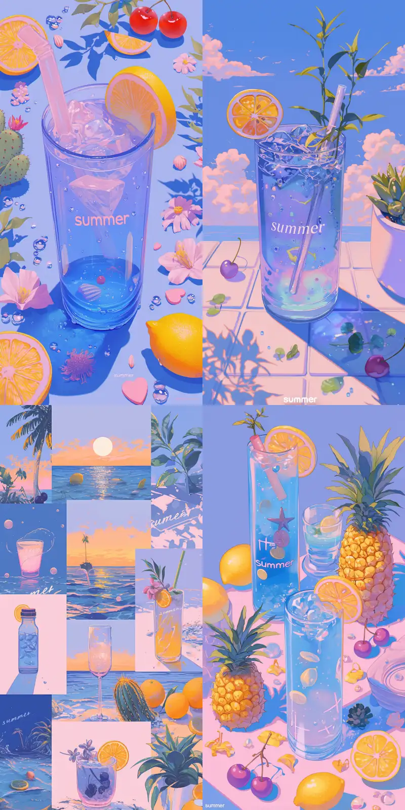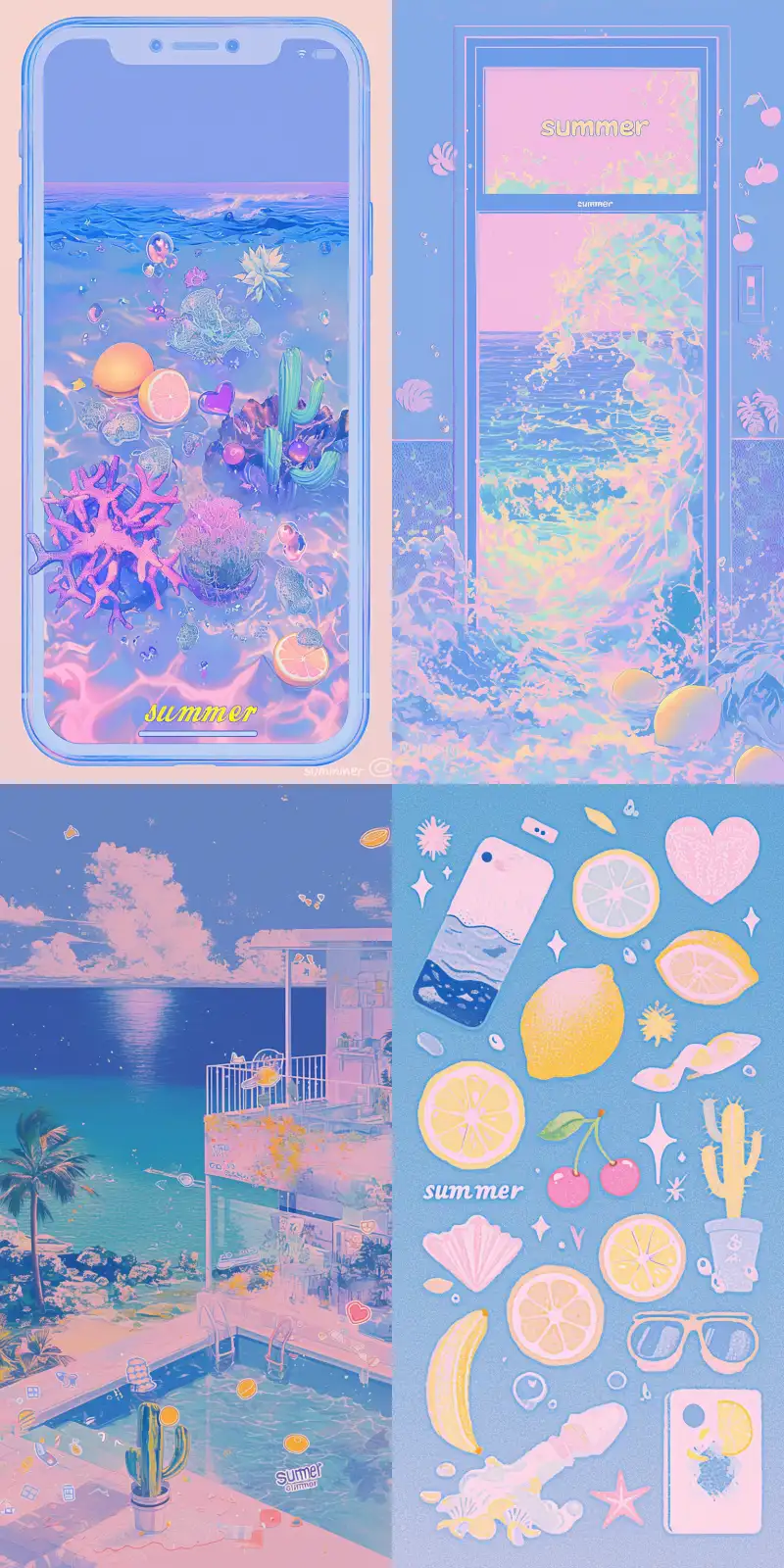 Midjourney Bot 更新时间:2024-08-05 00:10Create a full screen mobile wallpaper with an epic composition and masterpiece. In the style of retro sticker art, a collage features various stickers, including ocean images and text "summer", pink, yellow, and sea blue, with added cactus, heart, Mediterranean patterns, lemon, cherry, and playful fonts that read "summer". Use bold colors and add more soft tones to create contrast --niji 6 --ar 1:2 --sref 1861698704::1 1282649961::0.5 456250672::1 --s 750