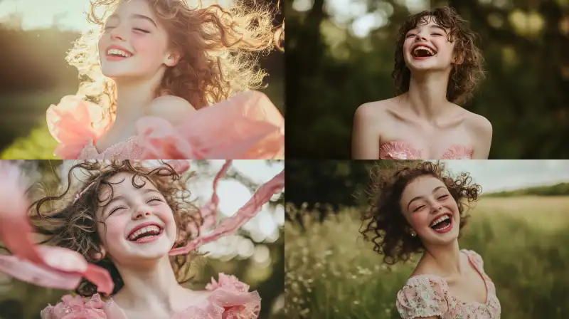 Midjourney Bot 更新时间:2024-08-05 00:12Humanistic documentary photography, portrait photography, young girl, full body portrait, wearing a retro pink wedding dress from the 1980s, 80s retro makeup, hair curled up, with curly hair in front of the forehead, laughing heartily, in the county environment, retro photography, retro filters, noise, blur, ribbon dancing --v 6.1 --ar 16:9