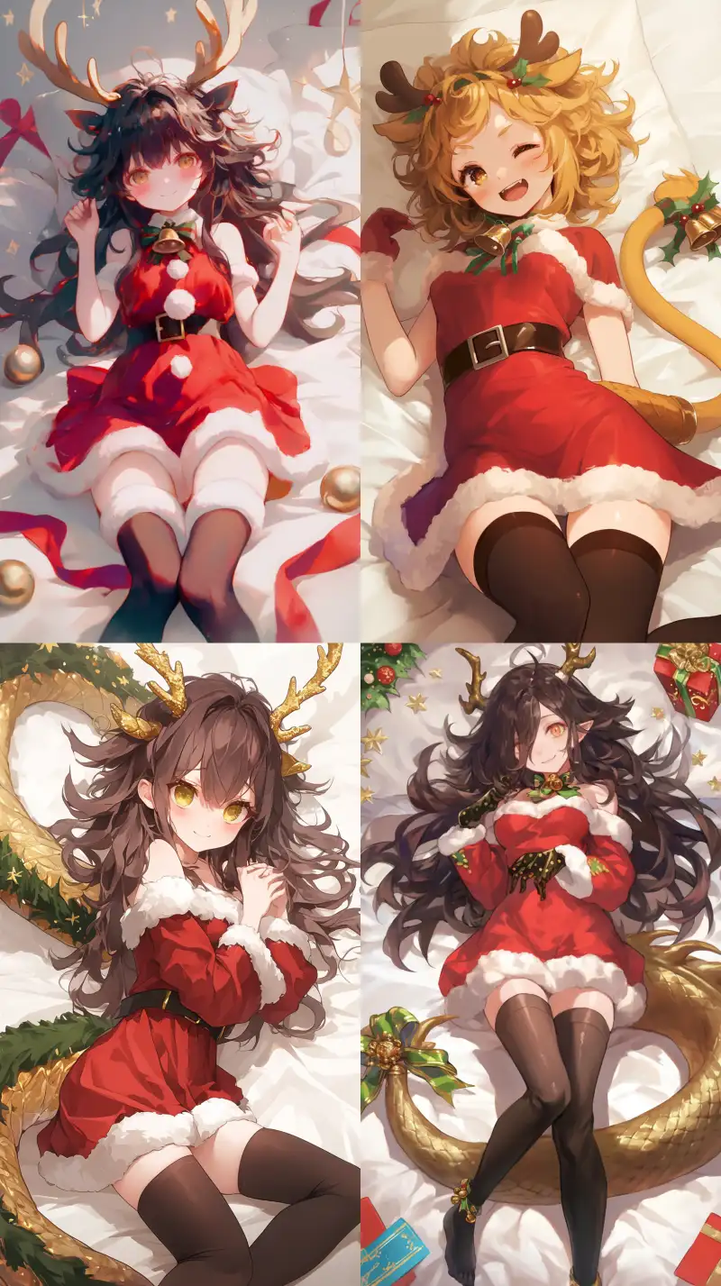 Midjourney Bot 更新时间:2024-08-06 00:01by ningen mame,pseudo- impasto, A cute anime girl, dressed in Christmas clothes and stockings, with messy hair lying on the bed, smiling with joy, wearing a red dress decorated with a white collar and a black skirt with a yellow border, chestnut eyes, and a golden dragon tail curled up behind her. The background is light gray, and the illustrations are in anime style. high resolution --niji 6 --ar 9:16