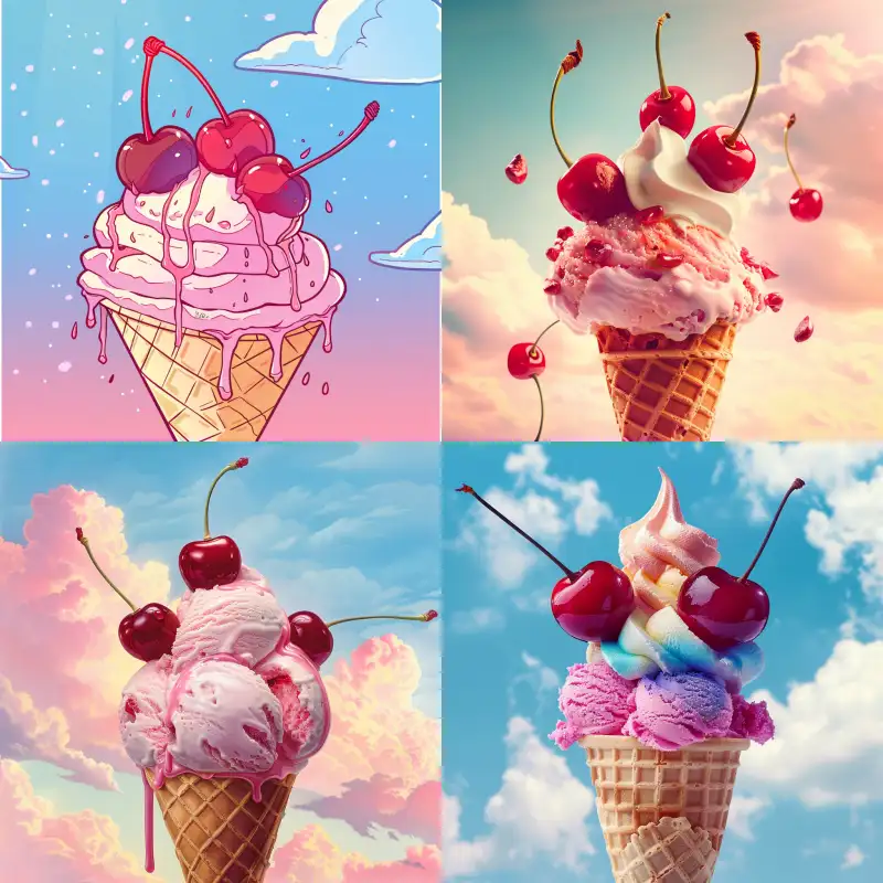 Midjourney Bot 更新时间:2024-08-04 00:19The background is very clear in the sky, with three cherries on a large ice cream cone, creating a colorful and cute atmosphere --v 6.0 --ar 1:1