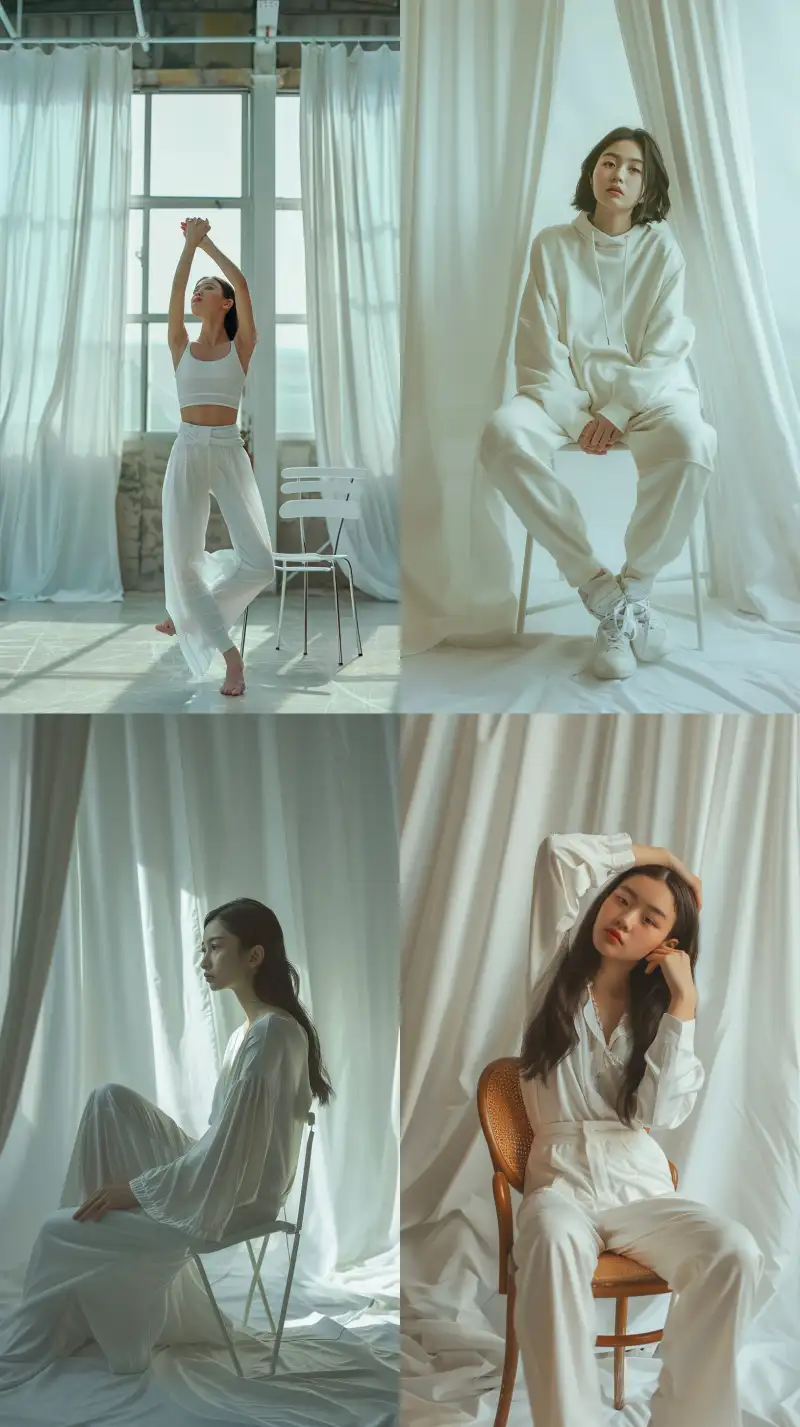 Midjourney Bot 更新时间:2024-08-05 00:05Fashion photography work, an Asian female model wearing Olympic gymnastics in a sports arena. The space is based on white color, with a bright industrial simplicity, covered with curtains and a chair. The light is soft, the color contrast is strong, and it exudes youthful vitality. Highly realistic photography, medium shot, best quality, ultra detailed, 8k resolution --v 6.0 --ar 9:16 --style raw