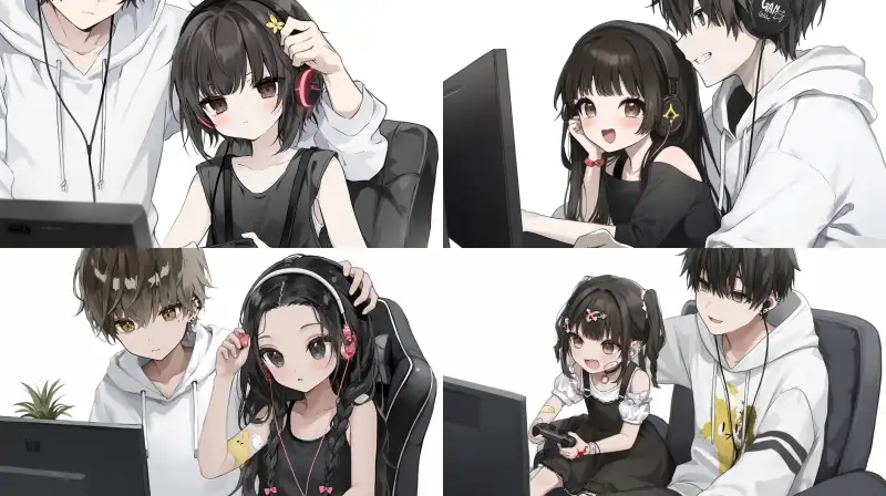 Midjourney Bot 更新时间:2024-08-05 00:08The girl is black and straight, wearing suspenders and headphones, sitting in the boy's arms playing games. The boy wears a white hooded sweatshirt and earrings --sref