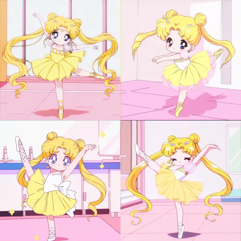 Midjourney Bot 更新时间:2024-08-03 00:13In the anime style of the 1990s, a cute 5-year-old chibi Sailor Moon with golden long hair, wearing a yellow ballet skirt and dance shoes, dances ballet in the dance studio. The warm scene features a happy style, Kawaii aesthetics, bold colors, and meticulous design --sref