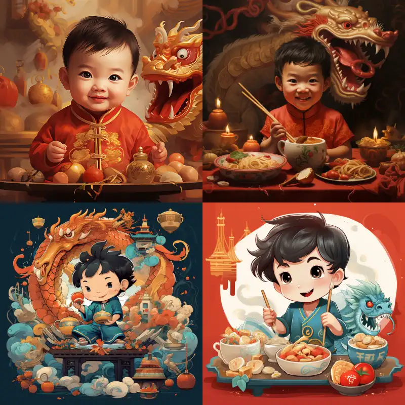 Midjourney Bot 更新时间:2024-08-03 00:14The Year of the Loong Baby Hundred Day Dinner Invitation, Dragon Element, Boy --v 5.2 --ar 1:1