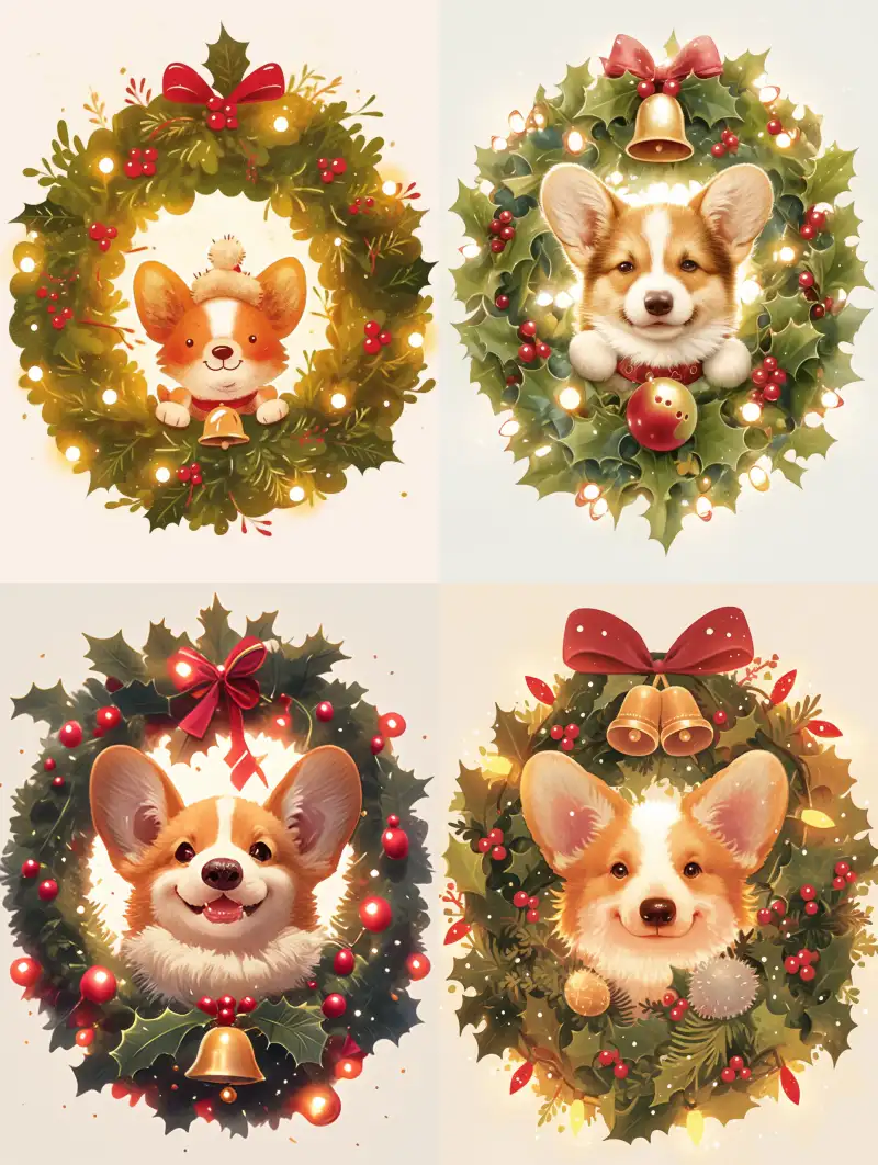 Midjourney Bot 更新时间:2024-08-03 00:15On the cover of children's illustration, there is a big Christmas wreath with holly leaves, berries and red colored lights. In the middle of the wreath is a very cute corgi puppy wearing a Christmas bell with a fuzzy ball. corgi puppy smiles with a crooked head. The background is clean and pure white. --niji 6 --ar 3:4 --no Face Hand deformity, Low image quality, written words --s 201