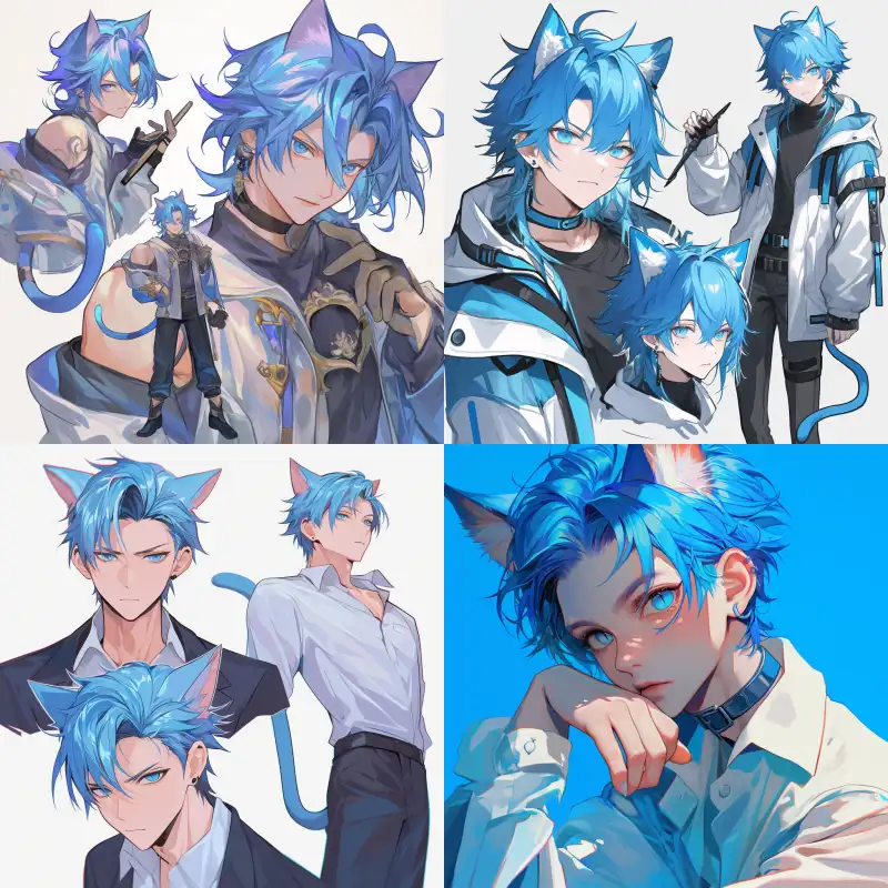 Midjourney Bot 更新时间:2024-08-04 00:00A handsome young man with blue hair and blue pupils, a cool guy with Cat's ears (Steamed cat-ear shaped bread) and cat tails, three view design drawing, carefully drawn, digital art, high fidelity, rich details, full of motion, blue rendering, soft colors, smooth lines, exquisite design, high quality --niji 6 --ar 1:1