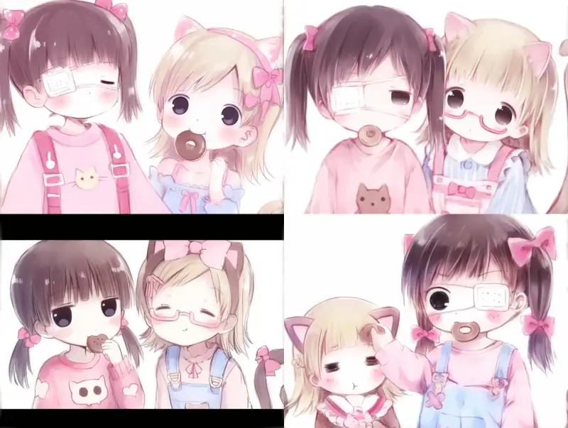 Midjourney Bot 更新时间:2024-08-02 00:04Two cat eared girls are together, one wearing a dark ponytail with an eye mask and a pink maid outfit, the other wearing a light gold ponytail with glasses and a blue maid outfit, blushing. One girl is eating a biscuit in her mouth, and the other girl is acting cute like a cat --sref