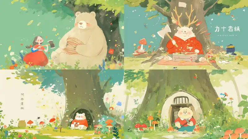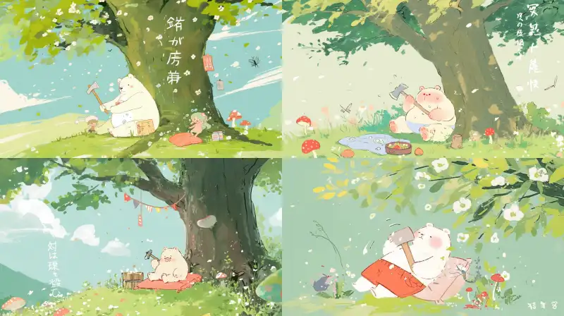 Midjourney Bot 更新时间:2024-08-02 00:05Underneath the big tree lay a cushion, with a chubby bear holding an axe running to chop down mosquitoes, sweating profusely. Surrounded by flowers and mushrooms, the character had big eyes and was cute and beautiful, --sref
