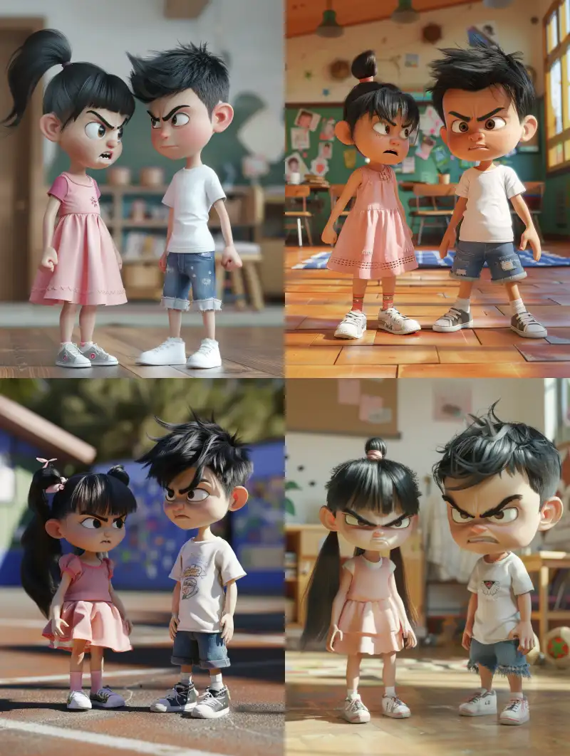 Midjourney Bot 更新时间:2024-08-02 00:07Disney 3D animation style, the two characters in the picture are two elementary school students: a little boy and a little girl, they are talking. A six-year-old girl wearing a pink dress, white sneakers, bangs, and a black ponytail, with an angry expression. A six-year-old boy wearing a white T-shirt and denim shorts, white sneakers, black hair, and speaking with his head down. Classroom background, ultra realistic rendering, medium angle, bright lighting, sufficient surface light, Disney 3D cartoon, wide-angle lens, dynamic capture, bright colors --v 6.0 --ar 3:4