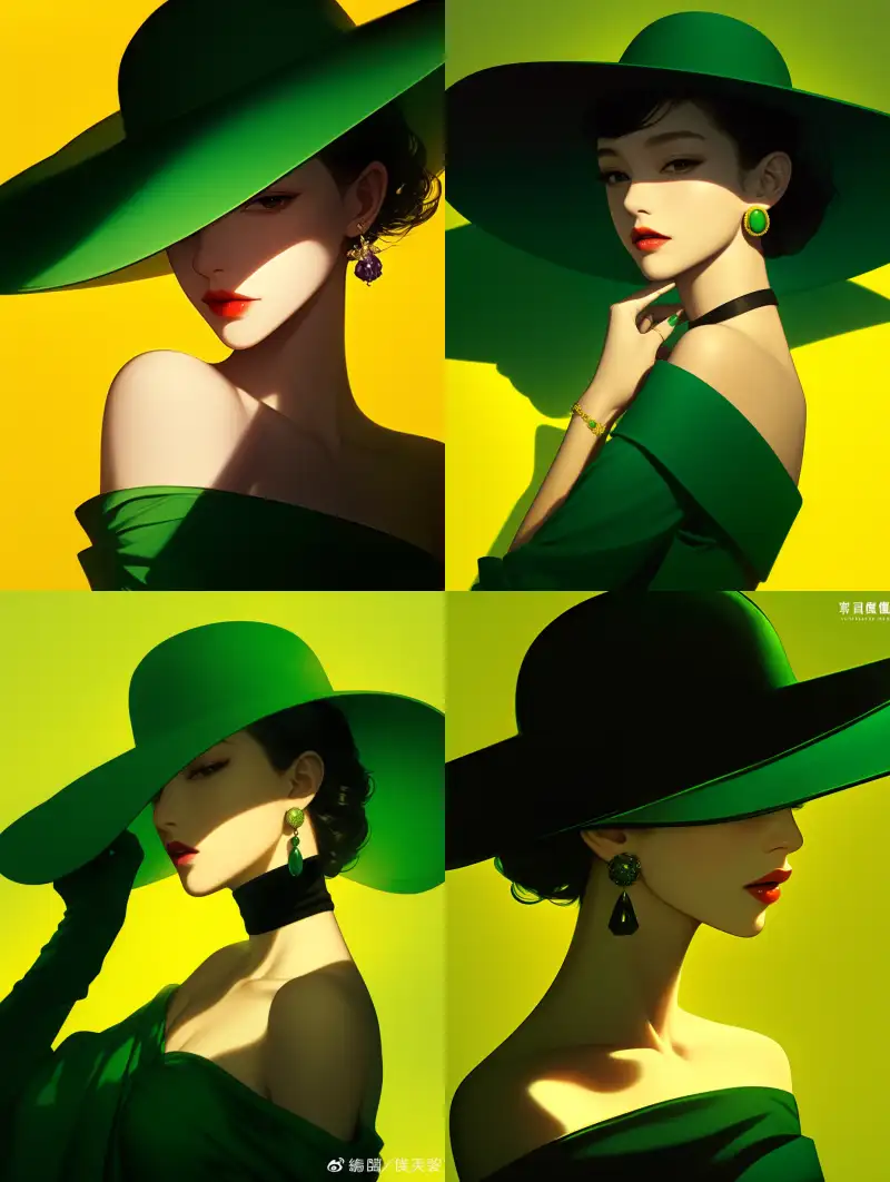 Midjourney Bot 更新时间:2024-08-02 00:08Ladies, lips tightly closed, off shoulder mint green dress, purple big hat, purple theme, solid color background, fashionable style, exquisite makeup, full-length lens, upper body close-up, high-definition photography, facing forward --sref