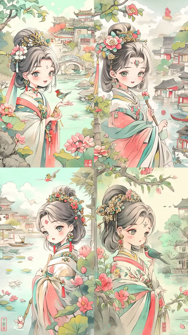 Midjourney Bot 更新时间:2024-08-03 00:00A small bridge and flowing water in a Jiangnan water town, surrounded by green trees and peach blossoms in full bloom. A lovely girl stands on an ancient stone bridge waiting for a man. Red lanterns hang on the white wall by the river, creating a lively atmosphere with warm colors. The traditional ink painting style is used, with hand drawn lines and cute cartoon characters. The overall color scheme is light pink blue, creating an elegant scene. This is a Chinese style Jiangnan water town comic. In spring, there are small bridges and flowing houses, surrounded by blooming peach blossoms. It features soft pink colors, exquisite lines, and ink paintings, creating vivid scenes in the style of Chinese artists. The hand drawn cartoon illustration style captures complex details with soft pink colors, showcasing rural life during the Spring Festival. The energetic atmosphere is clear in facial structure and delicate in body structure, with a focus on the face, The cartoon style illustrations of Jiangnan Water Town showcase characters in soft colors, with small houses and bridges in the background, forming a picturesque landscape painting with watercolor and traditional ink painting styles high resolution::4 ,Golden Ratio composition::3 ,lnk and wash painting::3 ,Moon rabbit,Cheongsam::4 --sref