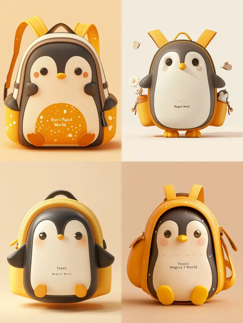 Midjourney Bot 更新时间:2024-08-01 00:05Cute children's leather backpack, cute little penguin shaped backpack design, black and white and yellow color matching. The product photo shows a simple light beige background with the brand name "Yoyo's Magical World" printed on it. The background of the product photo is simple and the style is minimalist, like a cute cartoon character. The minimalist background features high-definition details of studio lighting and high-resolution 3D rendering. Front view of the package. 3D rendering with high resolution and super detail, --niji 6 --ar 3:4 --s 126