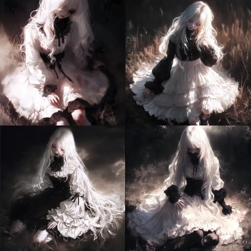 Midjourney Bot 更新时间:2024-07-30 00:12A figure dressed in a white Gothic dress with long white hair. She was slender all over, with long hands and legs, standing on the dry grass with her eyes closed. This scene is filled with a surreal tranquility and mystery, as if a creature has emerged from a fantasy world. --sref