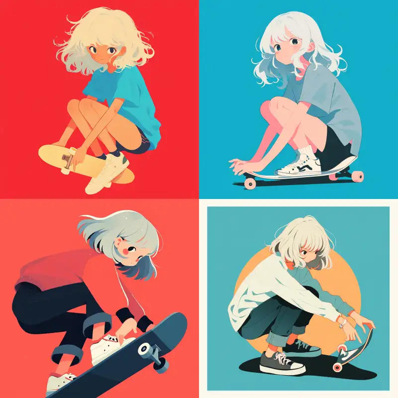 Midjourney Bot 更新时间:2024-07-30 00:15Pixar style, a cute silver haired girl with a skateboard on the ground, minimalist illustration --niji 6 --ar 1:1