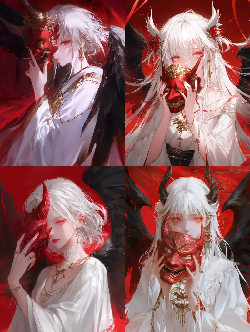 Midjourney Bot 更新时间:2024-07-30 00:01A white haired girl in white clothes with black wings, holding a red demon horn mask in front of her, half face, wearing earrings and a delicate gold necklace around her neck. Against a red background, a full body portrait in anime style is depicted, with soft light shining from above. Using digital art technology and red color tones, a mysterious atmosphere of Chinese painting style is created. --niji 6 --ar 3:4