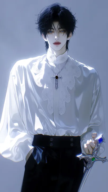 Midjourney Bot 更新时间:2026-02-18 00:09优雅禁欲冷艳男性角色,冷白瓷感肌肤,白色缎面荷叶边蕾丝立领衬衫,黑色双排扣高腰西裤,镶嵌黑宝石的银色十字架项链,镶嵌绿宝石的银质十字护手剑,上半身特写,干净中性灰背景,柔和漫射光,丝滑缎面质感,精致蕾丝质感,冷冽金属光泽,复古优雅贵族氛围,电影级灯光,高对比度,华丽克制气质,蓝色宝石饰品 斜线构图,人物居中,极致细节,暗黑哥特贵族美学,华丽宫廷风,欧式复古贵族美学,华丽洛可可风格,酒红黑银配色,柔焦光晕,柔和光影,金属质感,丝绒质感,梦幻朦胧氛围,电影级灯光,干净背景,高对比度,华丽危险气质,顶级画质,8K超高清 --zoom 1.5 --ar 9:16 --c 50 --stylize 800 --niji 7