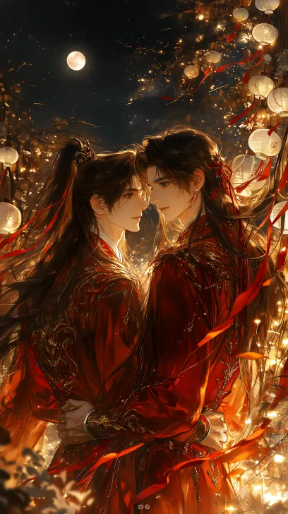 Midjourney Bot 更新时间:2026-02-18 00:10古风双人男性角色,面容俊美精致,皮肤冷白,雌雄莫辨,温柔对视,亲密依偎,高马尾束发,红色发带随风飘动。身着华丽的红色中式婚服,广袖长袍,衣袂飘飘,带有精致的金色刺绣暗纹与配饰,伪厚涂CG插画风格。背景是浪漫的古风夜景,深邃的夜空布满繁星,一轮满月悬挂天边,花树枝桠间挂满成串的白色纸灯笼,暖黄的灯光与红色的飘带交织,营造出氛围感满满的浪漫婚典场景,色调温暖而富有故事感。 --ar 9:16 --c 33 --weird 407 --stylize 539 --niji 7