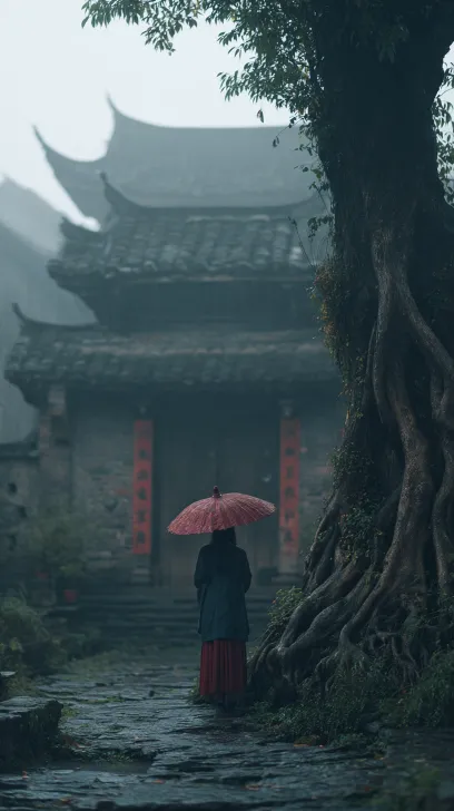 Midjourney Bot 更新时间:2026-02-18 00:13摄影效果,昏暗的雨天,电影色调,气氛压抑感,背景大雾弥漫,朦朦胧胧,前景:一颗弯腰的苍劲大树,树根盘根交织,一条弯曲的石板小路通向前方一个徽派建筑的村寨大门,大门里是错落有致的徽派民居,一个盘着头发、披着披肩、穿着长裙、知性、美丽的东方女性背对着镜头看着远方 --ar 9:16 --v 7 --stylize 100