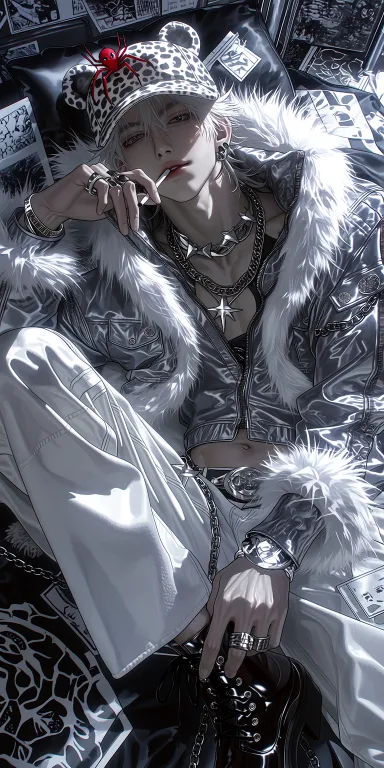 Midjourney Bot 更新时间:2026-02-18 00:18动漫厚涂风格,高角度拍摄,近景,半身特写,鱼眼镜头,镜头从上往下拍摄,一个帅气的男性少年,白色头发,黑色反光的耳钉,他穿着暗黑奢华街头风格装束,短款灰色人造毛皮带帽夹克,内衬灰色,袖口宽大且采用拉链式结构,搭配高腰白色喇叭裤,侧边饰有灰色人造毛皮面板;黑色粗跟踝靴;银色叠层项链;尖刺项圈领口;双手佩戴多枚银色戒指;挂于腰间的链条腰带;耳环为耳环套和黑色铆钉耳坠;充满前卫感的高档街头服饰美学风格;整套造型清晰可见,布料质感真实细腻,细节丰富,具有电影感的光照效果,光线效果逼真,细节丰富(设计感强烈,带有强烈的y2k,亚文化风格),头上戴着豹纹贝雷帽(贝雷帽上面有一只仿真红蜘蛛的装饰,质感细腻,红色的反光),平躺在床上(黑白的床,床的被子是黑白色抽象图形或哥特/赛博朋克风格图案如十字架、闪电、图腾图案),背景是现代亚系房间,墙上有y2k文化的涂鸦和海报,各种亚文化的装饰,东西随意放在地上,画面对比颜色鲜明,皮肤细腻光滑(皮肤具有光泽感),面部流畅,帅气的,随意的,光感强烈,画面冲击感强,带有一丝侵略性,人物面对着镜头,少年感,手指夹着烟对着镜头互动(贝斯反光,质感逼真) --ar 1:2 --c 7 --stylize 825 --niji 7