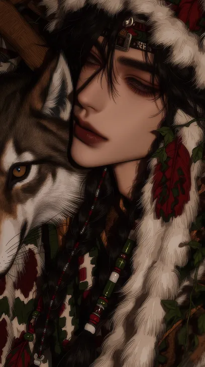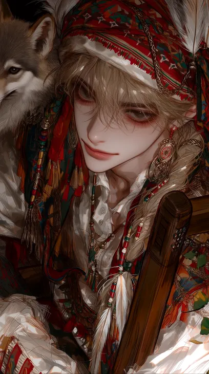 Midjourney Bot 更新时间:2026-02-18 00:21韩式厚涂风格,2.5D游戏美术质感,明显的笔触细节,强烈的材质对比,韩式半厚涂,cg质感,真人感,异域风,男性,五官绝美,狭长眼,整体氛围既内敛又充满张力,眼神深邃,狂傲,不屑,表情冷酷,眼神凶,低头看向镜头,微笑,面部立体感强,深邃而迷人,带有领袖气质,成熟稳重,嘴唇呈 M 形,双眼皮,气质桀骜俊朗,散发危险气息,看镜头,慵懒狂野,服饰为印第安风格,复古色调下主色调为红、白、黄,绿色作为点缀,厚涂,光感朦胧,色彩层次丰富饱满。他的服饰身着有毛绒质感、繁复垂坠褶皱、华丽饰品和传统衣服暗纹的印第安服饰,十分高级,带着印第安羽毛头饰,慵懒的看镜头,长发编成印第安传统发辫,发间点缀彩色串珠与羽毛。他的眼神清冷又含霸道,聚焦半全身局部特写,肩头有一只小狼,他躺在木椅子上,周围环绕精致的藤蔓花卉。气场强大。 --ar 9:16 --c 5 --weird 352 --stylize 1000 --niji 7 --profile wvv8u6m --no 眼镜,胡子,兽耳