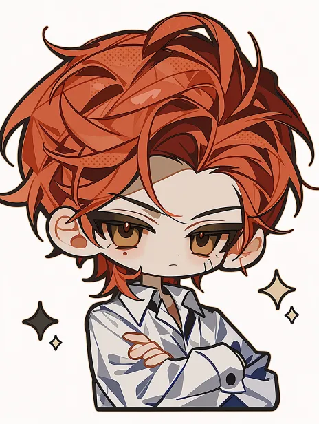 Midjourney Bot 更新时间:2026-02-18 00:22一个卡通可爱的迷你Q版小人 小人是男生 小人有着亮红色头发 小人的发型为红色狼尾 小人的瞳孔为深棕色 小人的神情淡漠清冷而疏离 小人的左侧脸有一个创口贴 小人的左眼下有一颗淡痣 小人的耳朵上没有装饰 小人穿着白色衬衫 卡通可爱 迷你Q版 --ar 3:4 --stylize 800 --niji 7