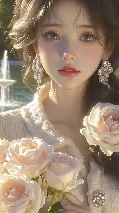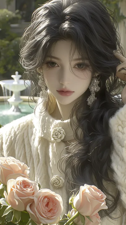 Midjourney Bot 更新时间:2026-02-18 00:24伪厚涂风格,BJD,优雅的少女,冷白皮,表情清冷,粉橘腮红,薄薄的唇瓣,细长眉,黑色瞳孔,眼妆点缀细碎珠光。乌黑长卷发,眼下有卧蚕,佩戴华丽的水钻耳环,尽显精致优雅。身着米白色羊绒翻领外套,外套纽扣是花朵的形状,一只手将头发捋过耳后,另一只手准备摘下淡粉色玫瑰。人物身处一片欧式花园,远处还有喷水池,柔和光线勾勒轮廓,整体呈现温柔的名媛气质,远景拍摄,游戏原画CG,64K UHD,HDR,超高细节,sharp focus --ar 9:16 --c 5 --stylize 777 --niji 7