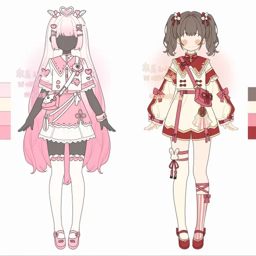 Midjourney Bot 更新时间:2026-02-18 00:22https://images.gogpt.vip/aigf/m_origin/20260218/1686785/bzp0wrs4i4lx4k3i.jpg 左侧:粉白爱心甜系洛丽塔风服设 整体风格 以粉白为主调,融合爱心、翅膀与兔子元素,营造出甜美梦幻的偶像少女气质,像是舞台上闪闪发光的甜系偶像。 头部配饰 渐变粉白长发,搭配粉色爱心发饰(带翅膀造型)与粉色发夹,整体软萌又充满梦幻感。 上衣细节 - 主体设计:粉白拼接上衣,领口为粉色荷叶边,缀有白色纽扣;衣身点缀粉色斜挎包(兔子造型)、爱心装饰与白色绑带,袖子为粉色荷叶边设计,手腕处佩戴黑色手环,增添了层次感。 - 装饰亮点:兔子造型的斜挎包与爱心元素呼应,强化了甜美元气。 下装细节 白色短裙,裙摆饰有粉色蕾丝边;腿部采用不对称设计:一侧为白色过膝袜(袜口带蕾丝),另一侧为裸腿搭配粉色绑带与条纹袜,既保持了甜系风格,又增添了个性。 鞋履 粉色小皮鞋,鞋身带有粉色装饰,与整体粉白配色完美融合。 右侧:红白中式甜酷风服设 整体风格 以红白为主调,融合中式结、流苏与蝴蝶结元素,营造出甜酷交织的国风少女气质,像是从传统画卷中走出的灵动少女。 头部配饰 棕色双马尾,搭配红色中式结发饰与红色发夹,既保留了中式韵味,又增添了甜美元气。 上衣细节 - 主体设计:红白拼接上衣,领口与袖口为红色荷叶边,缀有白色蝴蝶结与红色中式结;衣身点缀粉色绑带与流苏,袖子为红色荷叶边设计,层次丰富又充满国风感。 - 装饰亮点:中式结与流苏元素,强化了国风甜酷的风格张力。 下装细节 白色短裙,裙摆饰有红色棋盘格装饰与流苏;腿部为白色过膝袜,袜口处点缀红色中式结与小装饰,既保持了整体风格统一,又增添了精致感。 鞋履 红色小皮鞋,鞋身带有红色装饰,与整体红白配色呼应,强化了国风甜酷的气质。 --ar 1:1 --stylize 100 --iw 2 --niji 7