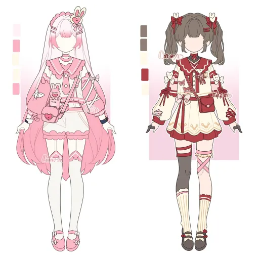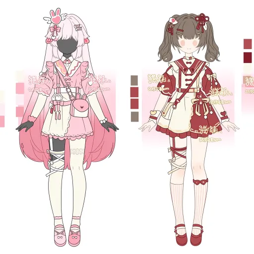 Midjourney Bot 更新时间:2026-02-18 00:22https://images.gogpt.vip/aigf/m_origin/20260218/1686785/bzp0wrs4i4lx4k3i.jpg 左侧:粉白爱心甜系洛丽塔风服设 整体风格 以粉白渐变为主调,融合爱心、翅膀与兔子元素,营造出甜美梦幻的偶像少女气质,像是舞台上闪闪发光的甜系偶像。 头部配饰 渐变粉白长发,搭配粉色爱心发饰(带翅膀造型)与粉色发夹,整体软萌又充满梦幻感。 上衣细节 - 主体设计:粉白拼接上衣,领口为粉色荷叶边,缀有白色纽扣;衣身点缀粉色斜挎包(兔子造型)、爱心装饰与白色绑带,袖子为粉色荷叶边设计,手腕处佩戴黑色手环,增添了层次感。 - 装饰亮点:兔子造型的斜挎包与爱心元素呼应,强化了甜美元气。 下装细节 白色短裙,裙摆饰有粉色蕾丝边;腿部采用不对称设计:一侧为白色过膝袜(袜口带蕾丝),另一侧为裸腿搭配粉色绑带与条纹袜,既保持了甜系风格,又增添了个性。 鞋履 粉色小皮鞋,鞋身带有粉色装饰,与整体粉白配色完美融合。 右侧:红白中式甜酷风服设 整体风格 以红白为主调,融合中式结、流苏与蝴蝶结元素,营造出甜酷交织的国风少女气质,像是从传统画卷中走出的灵动少女。 头部配饰 棕色双马尾,搭配红色中式结发饰与红色发夹,既保留了中式韵味,又增添了甜美元气。 上衣细节 - 主体设计:红白拼接上衣,领口与袖口为红色荷叶边,缀有白色蝴蝶结与红色中式结;衣身点缀粉色绑带与流苏,袖子为红色荷叶边设计,层次丰富又充满国风感。 - 装饰亮点:中式结与流苏元素,强化了国风甜酷的风格张力。 下装细节 白色短裙,裙摆饰有红色棋盘格装饰与流苏;腿部为白色过膝袜,袜口处点缀红色中式结与小装饰,既保持了整体风格统一,又增添了精致感。 鞋履 红色小皮鞋,鞋身带有红色装饰,与整体红白配色呼应,强化了国风甜酷的气质。 --ar 1:1 --stylize 100 --iw 2 --niji 7