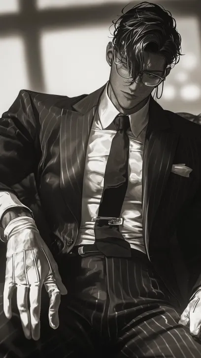 Midjourney Bot 更新时间:2026-02-18 00:27胶片颗粒感,一个俊美动漫男人,Spot Bokeh,浓密黑发,黑色,白色,透明感肌,身穿西装,领带,白手套和眼镜,黑色碎花西服裤,坐在沙发上 --ar 9:16 --style raw --stylize 180 --niji 6 --no no