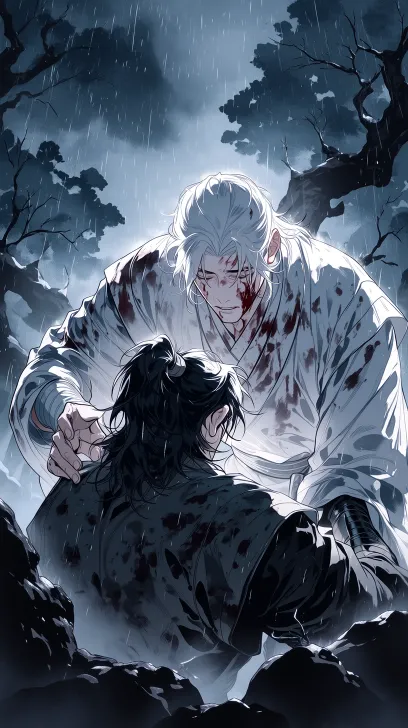 Midjourney Bot 更新时间:2026-02-18 00:27古风双人男性角色,一人头戴白色发冠,身着染满血迹的白色广袖长袍,嘴角带血,神情坚毅,伸手向前;另一人高马尾束发,身着深色劲装,虚弱地依偎在旁,神情痛苦。背景是暴雨中的山林,冷色调的灰蓝与墨绿交织,密集的雨丝、弥漫的雾气、枯树与泥泞的岩石营造出压抑悲壮的氛围,水墨厚涂插画风格,充满战损、悲情与生死相依的氛围感(类似长阶血未尽) --ar 9:16 --c 33 --weird 407 --stylize 539 --niji 7