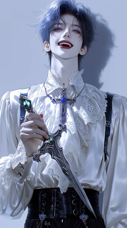 Midjourney Bot 更新时间:2026-02-18 00:28优雅禁欲冷艳男性角色,漂亮空灵的男生手里拿着镶嵌绿宝石的银质十字护手剑,水蓝色的亮泽短发,深蓝色的眼睛如同琉璃一般的光泽有深邃,纤长的睫毛,无辜又充满期待的眼神看着观众,甜美的笑,精致的五官,水润的双唇,冷白瓷感肌肤,白色缎面荷叶边蕾丝立领衬衫,黑色双排扣高腰西裤,镶嵌宝石的银色十字架项链,干净中性灰背景,柔和漫射光,丝滑缎面质感,精致蕾丝质感,冷冽金属光泽,高对比度,华丽克制气质,蓝色宝石饰品 斜线构图,人物居中,极致细节,暗黑哥特贵族美学,华丽宫廷风,欧式复古优雅贵族美学,华丽洛可可风格,酒红黑银配色,柔焦光晕,柔和光影,电影级灯光,金属质感,丝绒质感,梦幻朦胧氛围,电影级灯光,干净背景,高对比度,华丽危险气质,顶级画质,8K超高清 --zoom 1.5 --ar 9:16 --c 50 --stylize 800 --niji 7