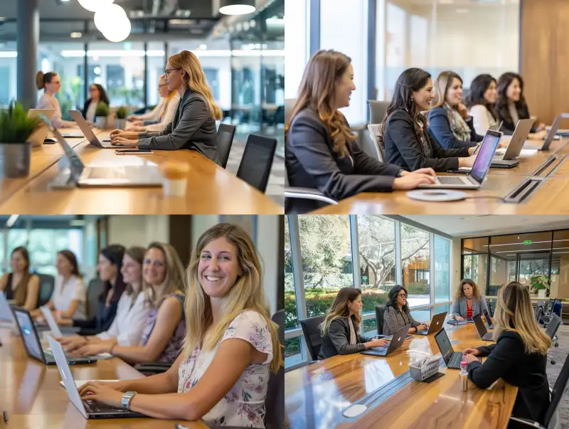 Midjourney Bot 更新时间:2024-07-28 00:08Business women sit at the conference table using laptops during office meetings, and the team is also present. The shooting style is Nikon D850 camera, equipped with a 24-70mm f/3 lens, with a zoom out lens to capture the entire scene and women working on the computer, natural lighting, and depth of field. --v 5.2 --ar 4:3
