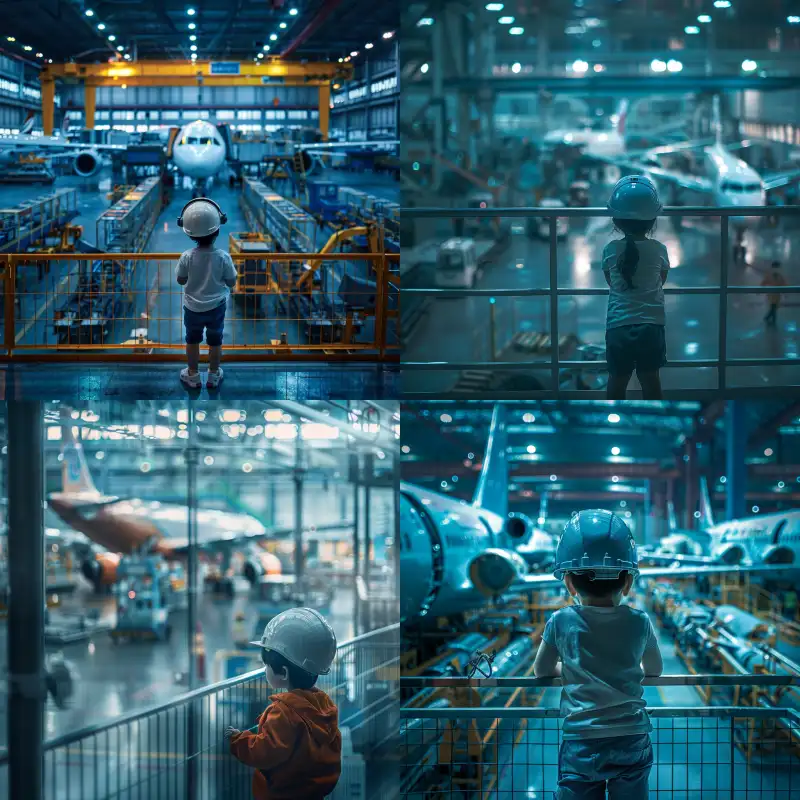 Midjourney Bot 更新时间:2024-07-28 00:09A cute Chinese child, wearing a safety helmet, standing high in an airplane factory with a protective fence, watching the production of small airplanes on a technological assembly line, smart factory, blue tone, realistic, photography level --v 6.0 --ar 1:1