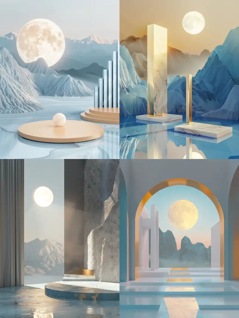 Midjourney Bot 更新时间:2024-07-27 00:09Chinese architecture, new Chinese aesthetics, high mountains, moon, minimalist style, gradient color matching, with a high stage setting style, minimalist setting, light gold and blue, minimalist stage design, 32k high-definition, vivid images --v 6.0 --ar 3:4