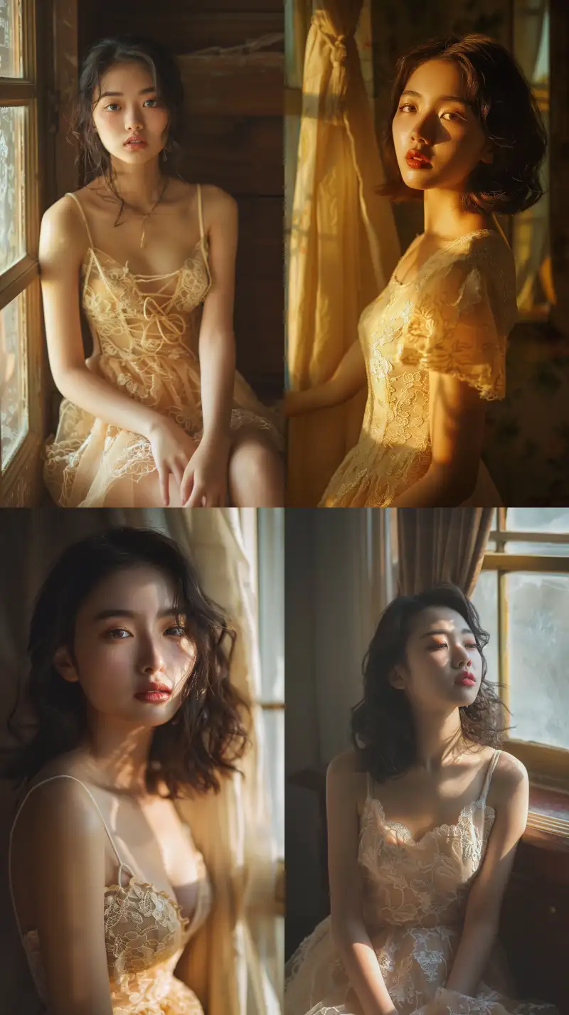 Midjourney Bot 更新时间:2024-07-27 00:07Portrait photography of an Asian woman wearing a dress indoors, with a lazy posture, light makeup, dark hair, warm color tone, soft lighting, beautiful skin texture, smooth lines, light yellow lace skirt, retro photo style, hazy feeling, medium distance. --v 6.0 --ar 9:16 --c 94