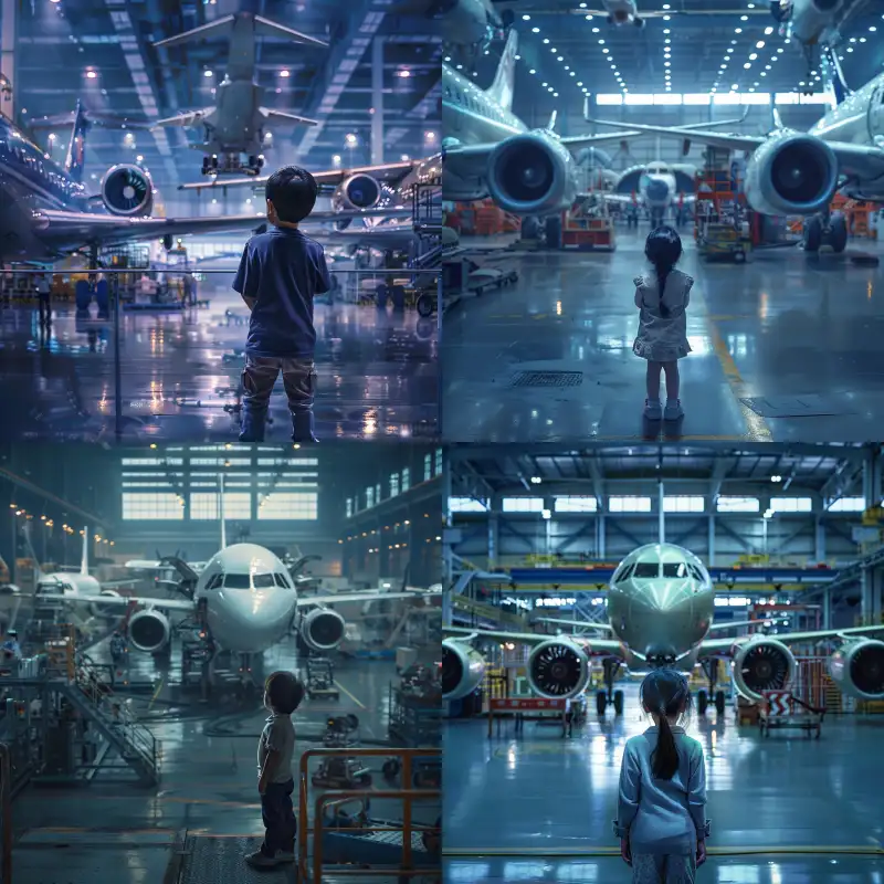 Midjourney Bot 更新时间:2024-07-28 00:00A cute Chinese child stands high in an airplane factory, watching the production of small airplanes on a technological assembly line, in a smart factory, with blue tones, realism, and photography quality --v 6.0 --ar 1:1