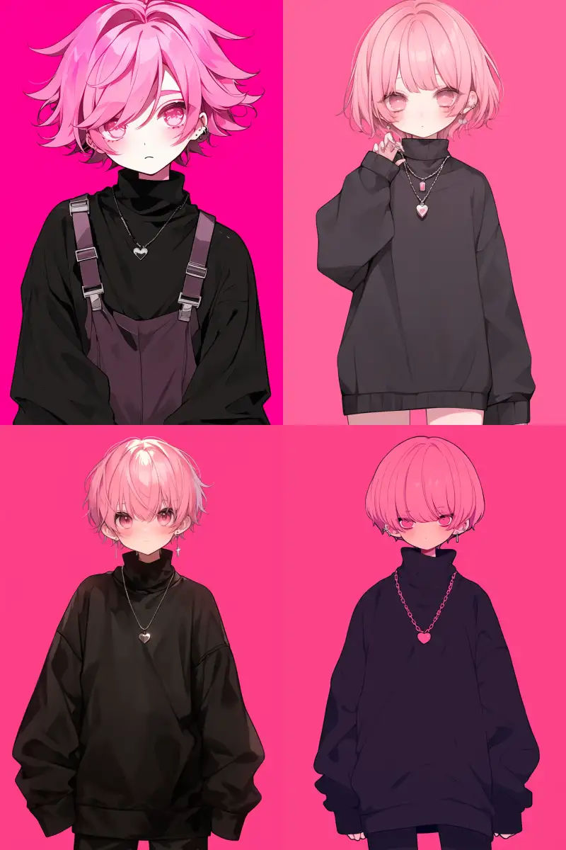 Midjourney Bot 更新时间:2024-07-27 00:02A cute anime boy with pink hair and a pair of pink eyes. He is wearing a loose black oversized long sleeved turtleneck sweater that can touch his knees. The long sleeves have a heart-shaped pendant around his neck and an open collar at the top of his coat. The background color should be pink. Black overalls, in the style of Japanese digital artists, created using digital art technology --niji 6 --ar 2:3