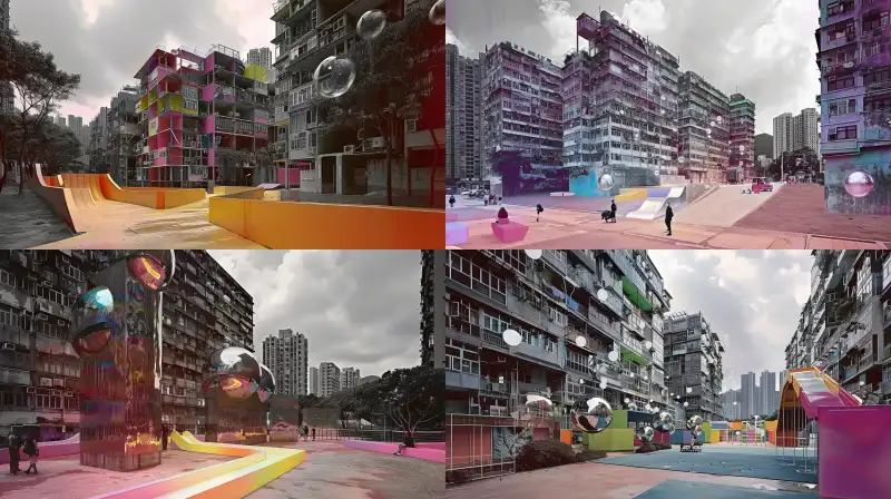 Midjourney Bot 更新时间:2024-07-27 00:06https://gogpt-img.oss-accelerate.aliyuncs.com/img/m_origin/20240727/648397/gxox1n8v2nmc4k46.jpg-thumb.webp In this project, we plan to carry out block renovation design for the Kowloon Walled City area in Hong Kong, aiming to transform this historic but relatively dilapidated area into a vibrant and modern public space. Our design philosophy integrates innovative art installations and interactive spaces, injecting new vitality into the city through visual impact and fun experiences. Design Concept 1 Vertical Space and Hierarchical Distribution: The renovation design will focus on creating a multi-level vertical spatial layout, creating rich visual hierarchy and spatial experience through areas of different heights. Each level will become a unique venue for showcasing art installations and interactive elements, inspiring people's interest in exploration and interaction. 2. Colorful stainless steel bubble device: In each level area, we will arrange brightly colored stainless steel bubble devices. These installations are based on modern sculpture art, combined with high reflectivity metal materials and vibrant colors to create charming light and shadow effects. Each bubble device will be carefully designed in shape and color to enhance visual appeal and become an important artistic node in the space. 3. Color slide system: In order to break the monotony of the space and enhance interactivity, we will set up color slides between bubble devices. These slides will complement the bubble device with streamlined design and vibrant colors, providing a safe and fun way of passage. The slide will encourage users of different age groups to move freely between different levels, adding fun and dynamism to the space. 4. Interaction and Community Participation: The design will focus on interaction with the community, taking into account the needs and interests of regional residents. The design of the bubble device will integrate local cultural elements and combine them with the historical background of the city to enhance the sense of belonging of the community. The layout of the slide will take into account the needs of different age groups, ensuring that all visitors can enjoy the fun of the space. 5. Environment and Sustainability: All installations will use environmentally friendly and durable materials to ensure their long-term reliability in urban environments. At the same time, green plant elements will be incorporated into the design to enhance the ecological environment and comfort of the space. We will strive to introduce modern design concepts while maintaining historical charm, to achieve sustainable development of the space. --v 6.0 --ar 16:9 --style raw