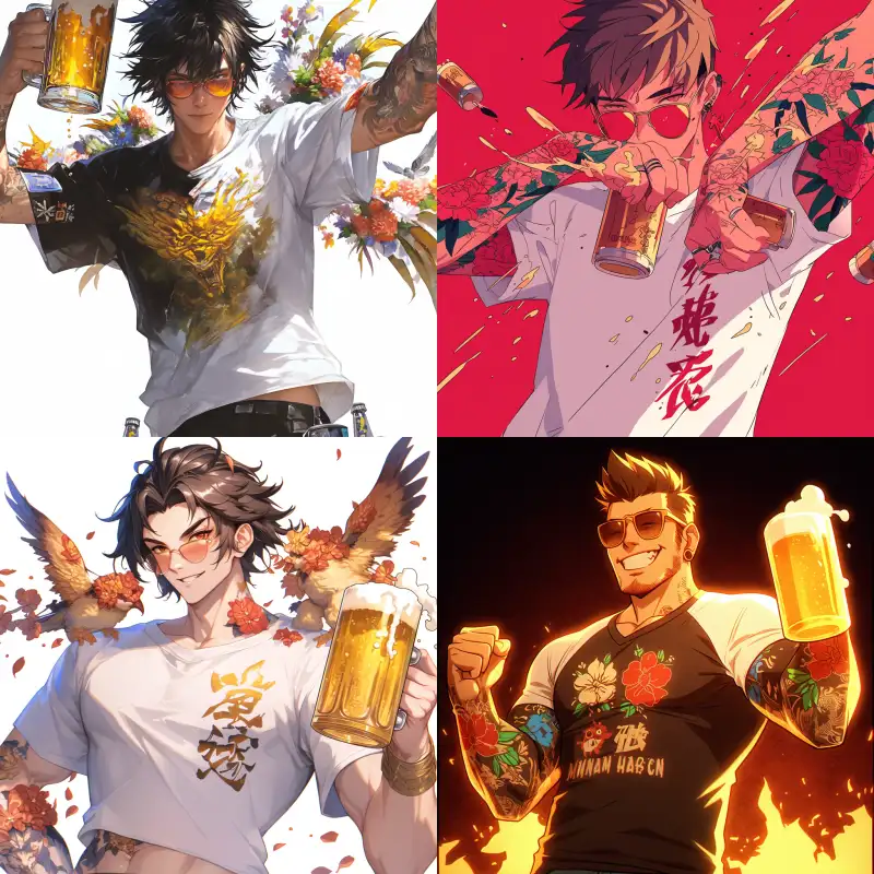 Midjourney Bot 更新时间:2024-07-22 00:06A boy with white short sleeves, a social youth, a socialite, a spirited young man, a hooligan, holding beer, tattoos, flower arms, wearing sunglasses, with floral characters on his clothes. My surname is Zhang, and the intricate details are very detailed. 4k, 1:1 --niji 6 --ar 1:1 --no The doll's joints --s 160 --c 7