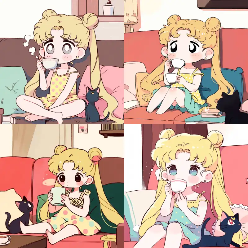 Midjourney Bot 更新时间:2024-07-22 00:09In the anime style of the 1990s, a cute 5-year-old chibi Sailor Moon with golden long hair, wearing a yellow polka dot thin shoulder strap dress, sitting on the living room sofa drinking milk tea, with a small black cat next to her. The warm scene is accompanied by a happy style, Kawaii aesthetics, bold colors, and meticulous design --sref