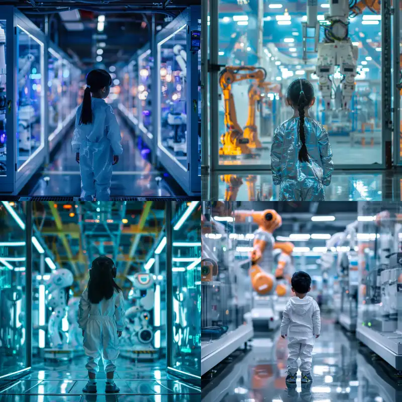Midjourney Bot 更新时间:2024-07-22 00:13A beautiful Asian child, wearing antibacterial clothing, facing away from the camera, taking a full body photo, in the production workshop of an intelligent factory, watching machine production, with robots, cool colors, high-tech, photography level, realism, bright environment, movie level lighting effects, full body photo --v 6.0 --ar 1:1 --style raw