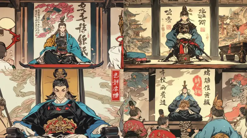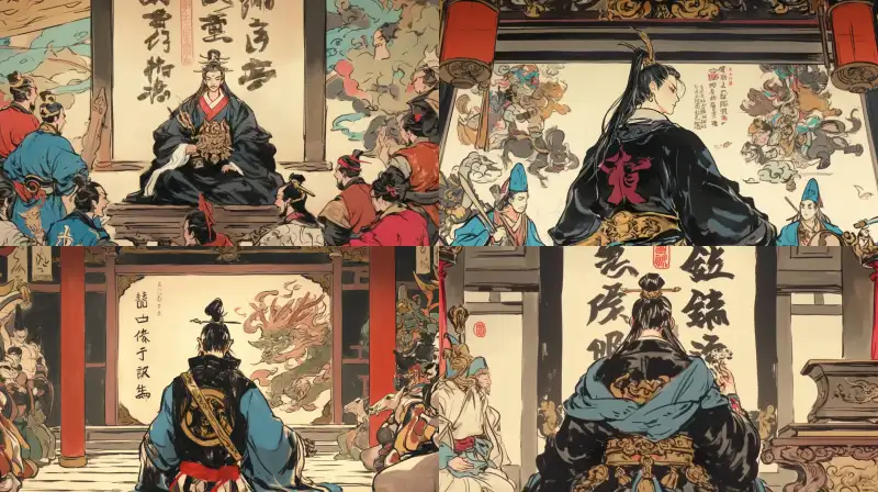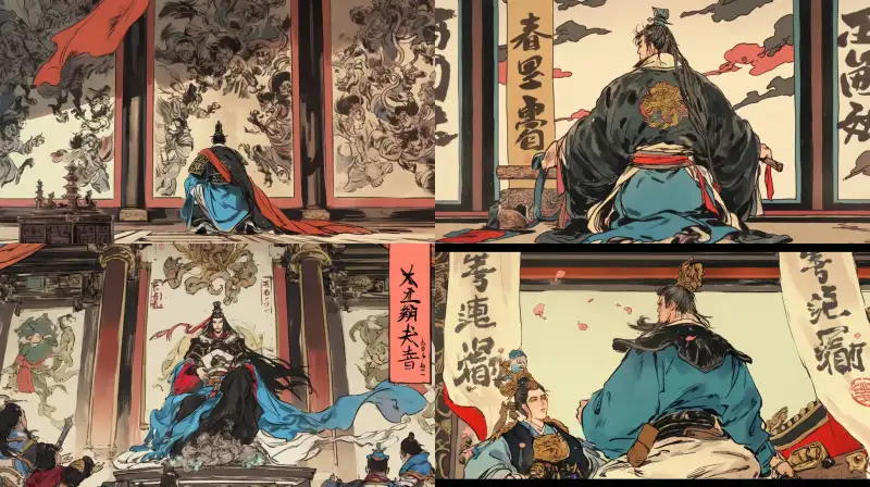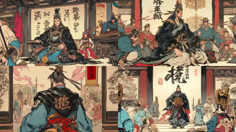 Midjourney Bot 更新时间:2024-07-20 00:04Looking down at the camera, in the palace, an ancient figure, the black clothed emperor, stands. In front of him is the blue clothed emperor holding the imperial jade seal and kneeling in front of him. Palace, palace --sref