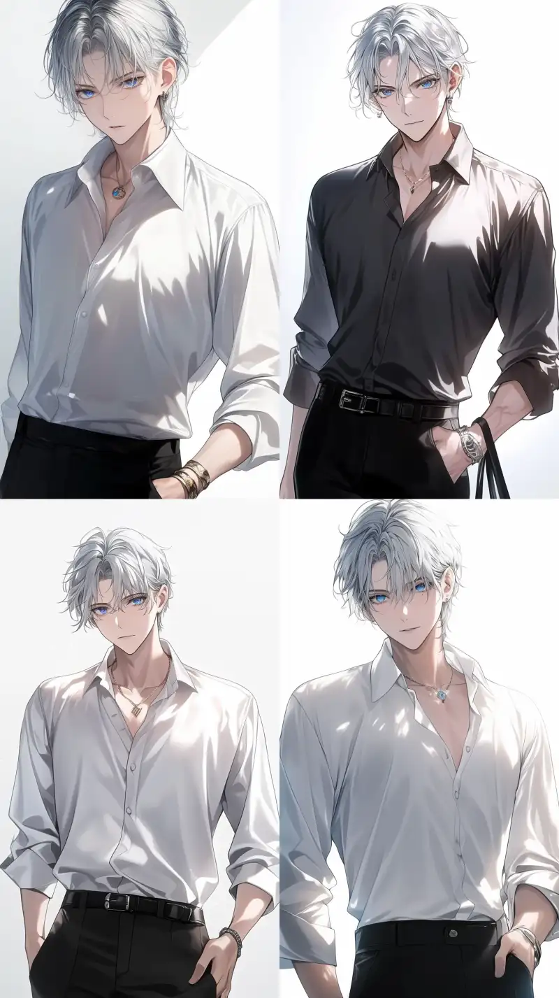 Midjourney Bot 更新时间:2024-07-17 00:06A handsome anime boy with silver hair, bubble sleeves, wearing an elegant white shirt and black pants on a white background. He has delicate facial features, blue eyes, one hand in a pocket, one hand outside, a ring on his hand, a slim figure, a pure background, and loose bubble sleeves --sref