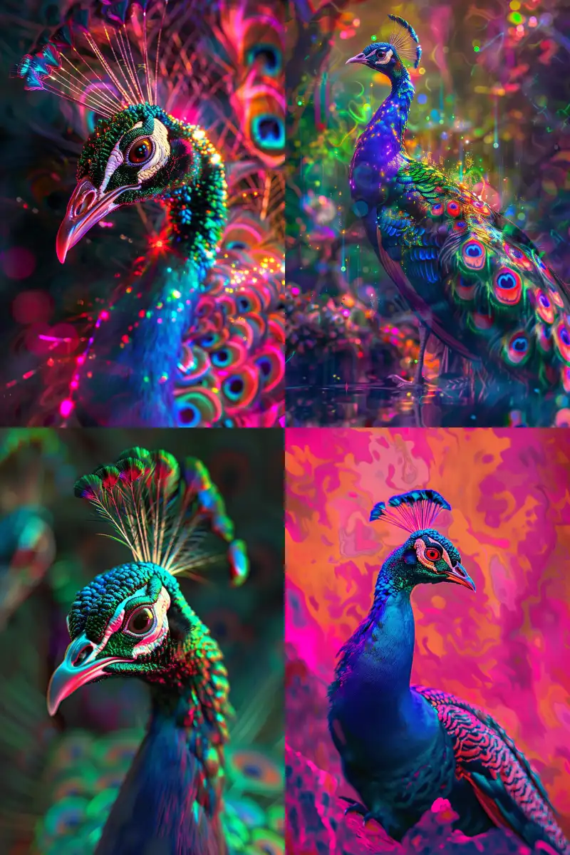 Midjourney Bot 更新时间:2024-07-18 00:00Fauvist style peacock illustration, neon lights, bright colors, soft shadows, movie lighting, clear focus, high resolution, high quality, high detail, octane rendering, volume lighting, global lighting, tone mapping, wide-angle --v 6.0 --ar 2:3