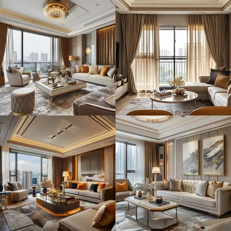 Midjourney Bot 更新时间:2024-07-18 00:00High rise living room with modern log luxury style, large area of walls are covered with plain color wall cloth with strong popular color texture, the wall behind the sofa is hard wrapped with warm color plain color wall cloth, the large french window on the left side of the wall is covered with fashionable and elegant curtains, the coffee table in front of the sofa is equipped with sofa and furniture with appropriate style, covered with carpets, luxurious interior design, warm lighting, modern log luxury decoration, and the effect of the whole living room is displayed from a distance in front, high-definition and realistic effect --v 6.0 --ar 1:1