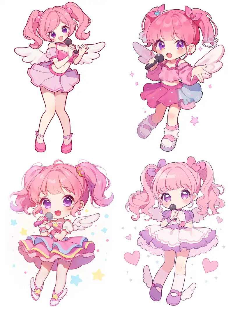 Midjourney Bot 更新时间:2024-07-18 00:00Kawaii Chibzi has pink hair, a double ponytail, a girl with purple eyes, holding a microphone to sing, a pink purple top, short sleeved bubble sleeves, a small waist, a pink purple short skirt, pink purple winged high heels, white background stickers, kpop anime style, Korean online cartoon style, standing posture, full body --niji 6 --ar 3:4 --style raw